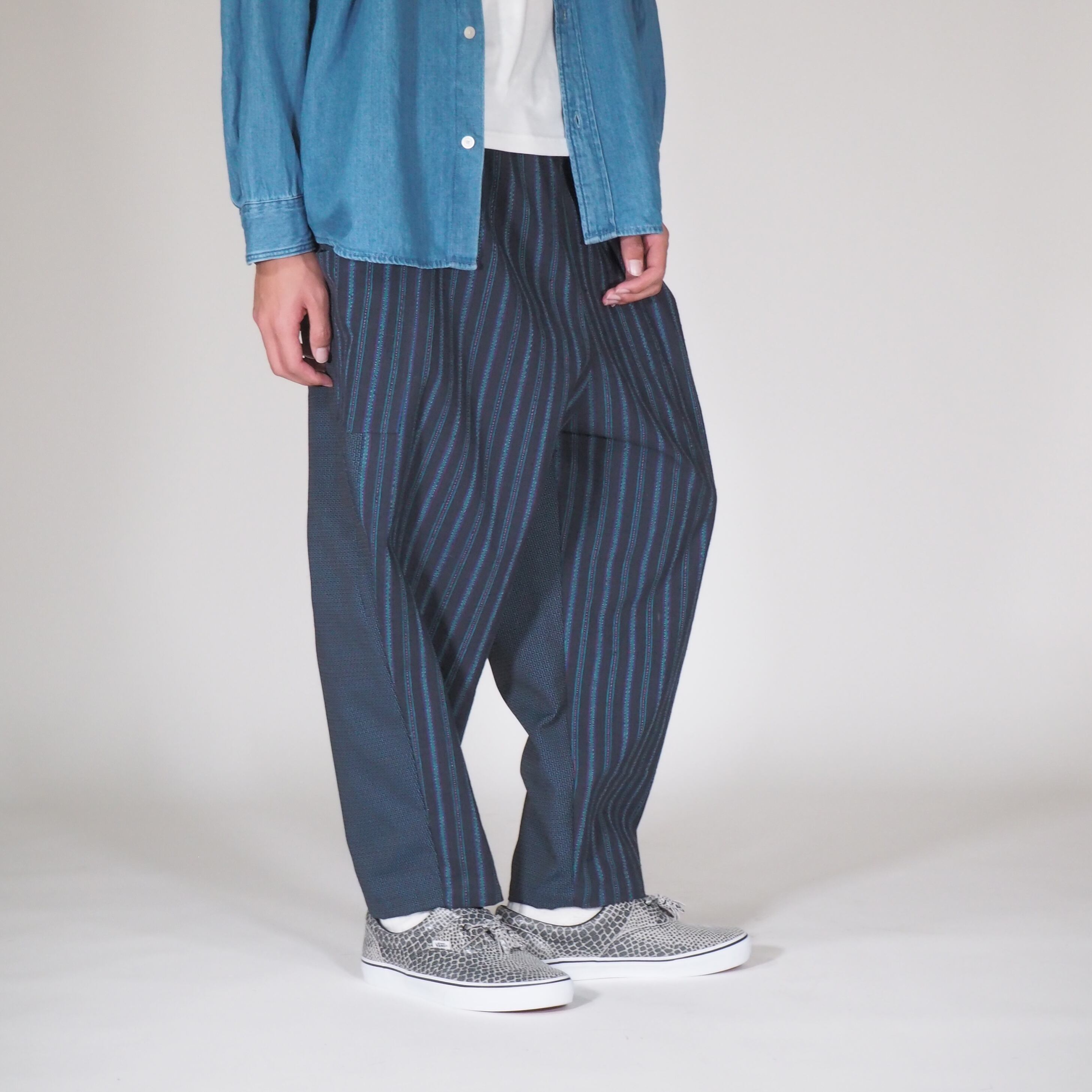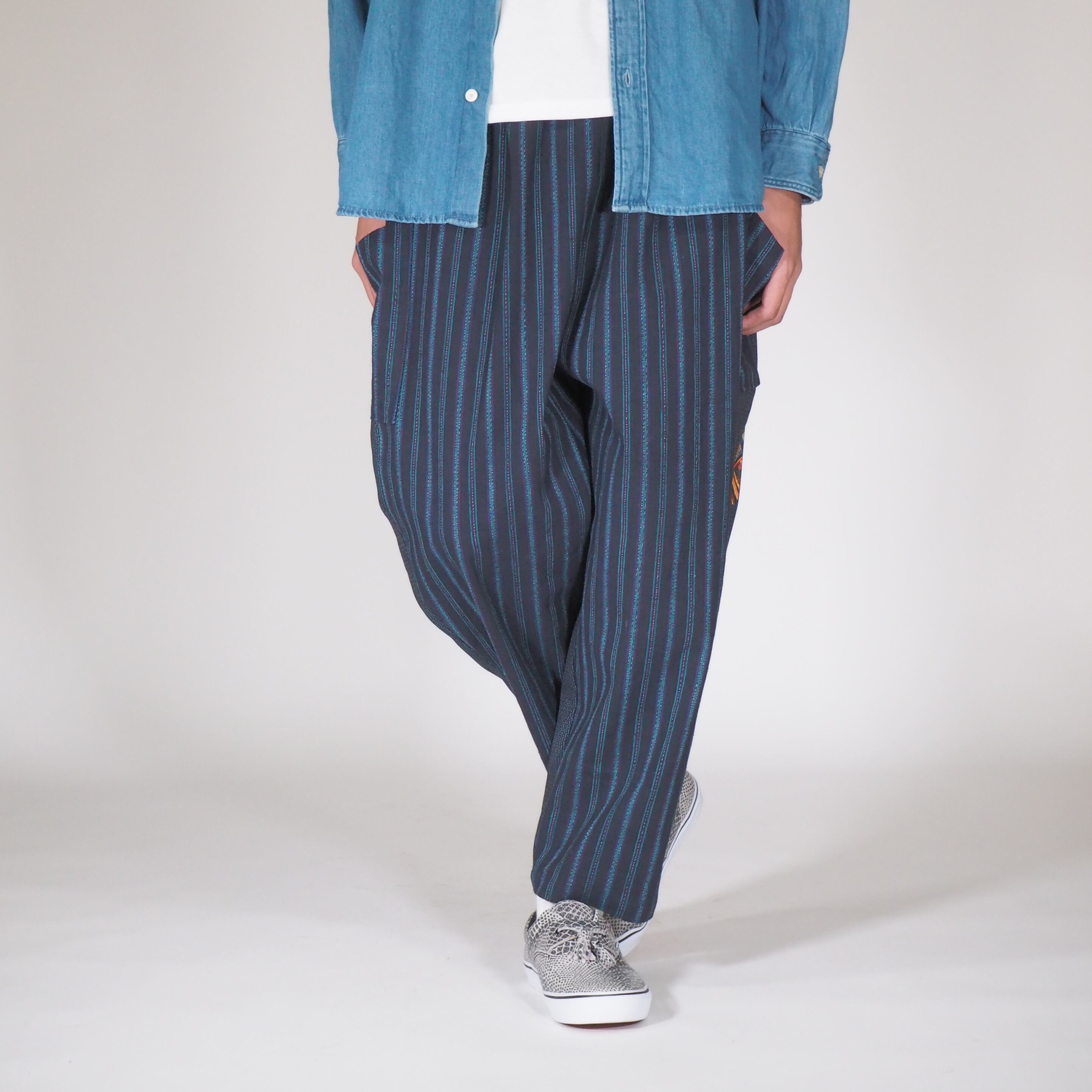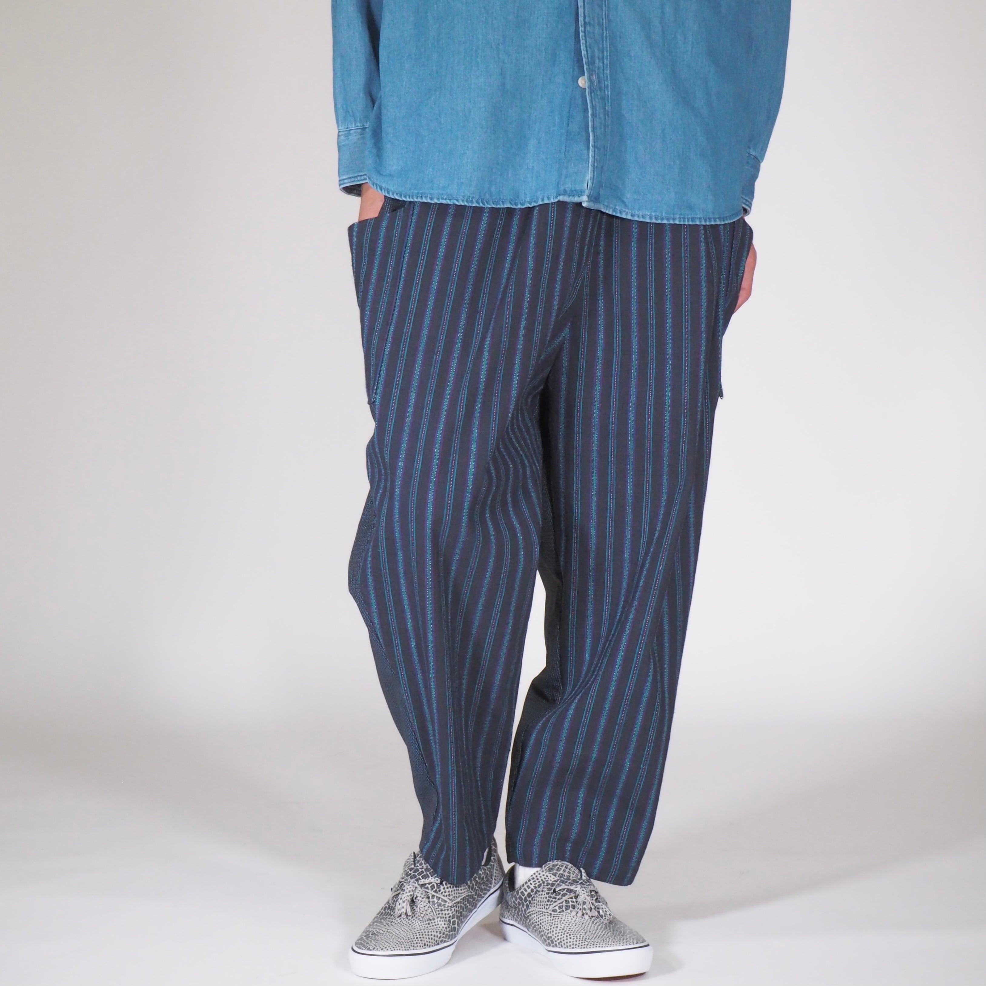 日本のヴィンテージテキスタイルと現代的な感性が融合した履きやすくアティチュードのあるパンツです。