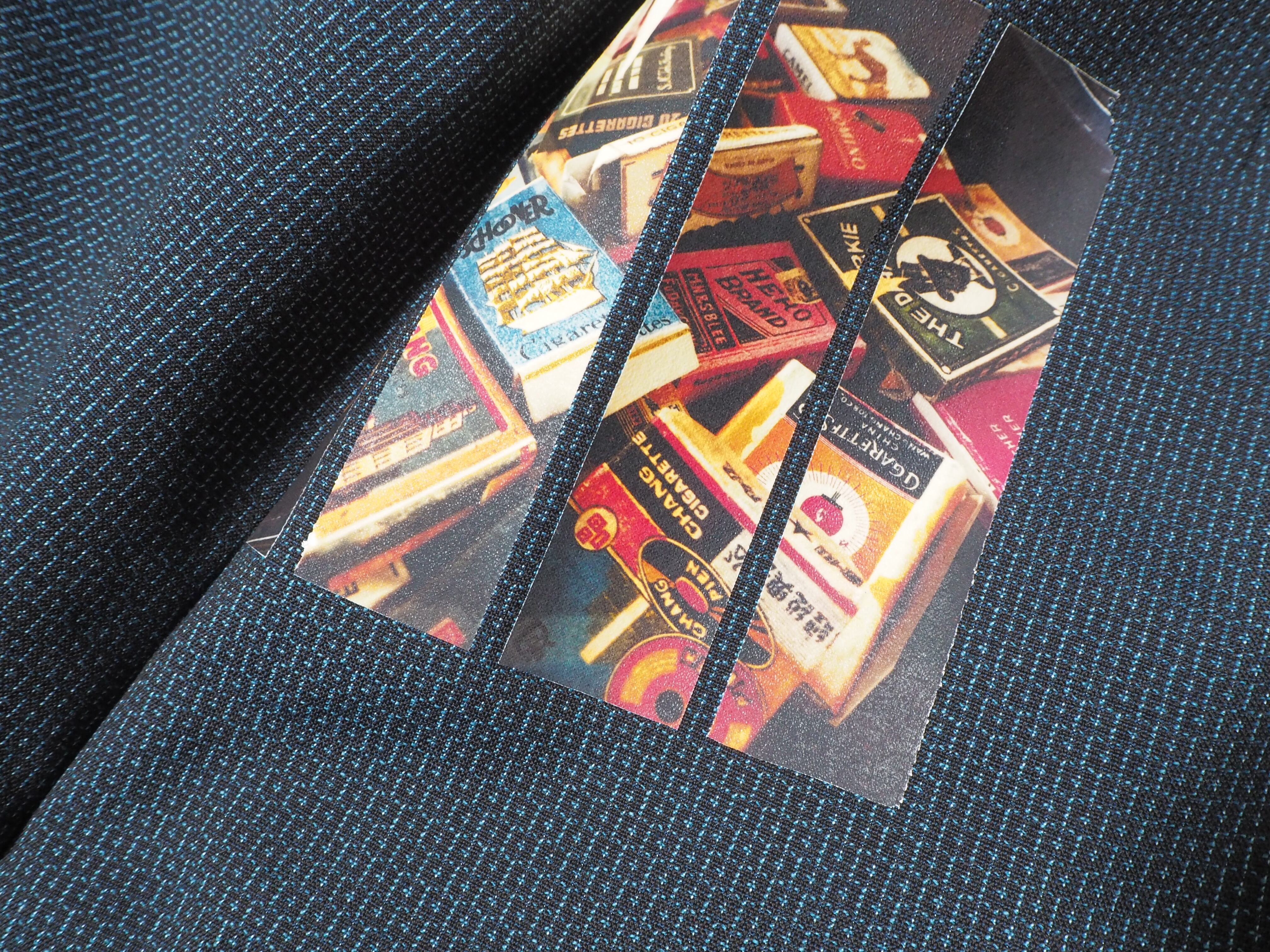千尋が撮影した写真をフォトプリントし、モンタージュのようにカット&コラージュしてパッチとして配置しています。